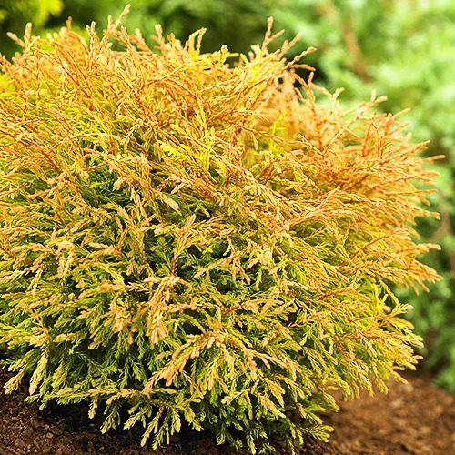 The Golden Tuffet Arborvitae is a unique and colorful dome-shaped dwarf evergreen with golden-yellow spring foliage, turning orange in summer and then purple-red with the intense winter cold. The foliage has a braided, thread-like look that is very different from most other arborvitae. This beacon of brightness shines out across your garden, but only grows 3 feet tall and 4 feet wide after ten years. It is the perfect choice for smaller gardens, the front of beds, along a path, or in planters and pots. It is very winter-hardy, down to at least zone 4, and it grows well everywhere except in places with very hot and humid summers.