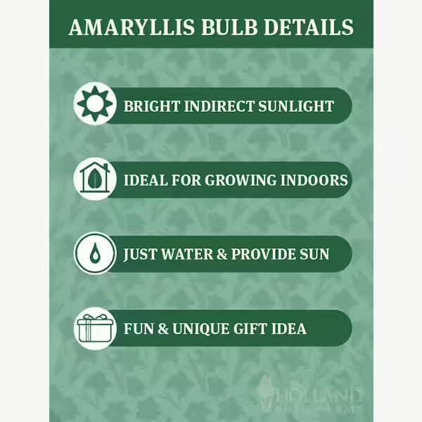 Place your Potted Minerva Amaryllis Bulb in a bright spot indoors, or in a heated porch. It should be in bright light, and although not necessary, some direct sun is beneficial. Water when the soil has become partly dry, and don’t leave it standing in water. Once blooming is over cut the flower stems down, but leave the foliage. If you fertilize and keep it growing through spring, you can then let it dry out completely, cut off the dead leaves and re-pot in late fall for it to bloom all over again. Generally free of any pest or disease problems, but don’t let pets nibble at it or eat the bulb.
