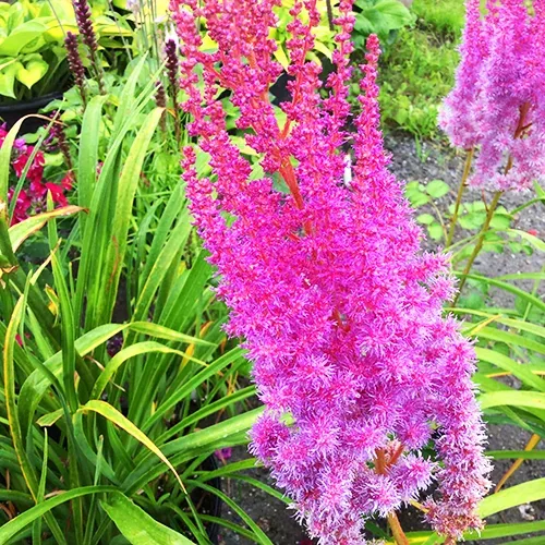 Most astilbe are a foot or two tall, but sometimes, perhaps in a larger bed, we want something taller and more statuesque. That’s the moment for the Purple Candles Astilbe. Flowering late in the season, after most of the other astilbe are over, this gorgeous plant sends up spires of flowers reaching 4 feet, deep burgundy stems and buds, erupting into glorious purple-pink columns. The stand above ferny foliage that grows about 2 feet tall, forming a substantial plant that really brings presence and structure to your shady beds. It thrives beside water and in damp soil, but unlike most other astilbe, this one is significantly more drought-resistant, and will grow in the sun in cooler zones. Plant it among hosta and tall ferns, with smaller astilbe and other shade-lovers in front. Very easy to grow and reliable, if it has sufficient moisture.