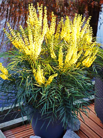 The Soft Caress Mahonia is a unique new plant that everyone wants. Its combination of soft, narrow foliage, fragrant, bright yellow winter flowers, and ability to grow well in partial to full shade, makes this a plant that no garden can be without. Winner of ‘Plant of the Year’ in 2013, this superb bush grows just 3 feet tall and across, and flowers in the winter for at least a month, lifting that dull season with bright color. It is perfect for filling those awkward shady spots that every garden has, and its evergreen foliage always looks great. With its ‘bamboo’ feel it is perfect for an Asian-style garden, or in a woodland garden, as well as in regular beds around your home. It also grows perfectly in containers and planters, bringing winter color to your terrace.