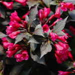 The Spilled Wine® Weigela is an easy, reliable shrub you will love. It has rich burgundy leaves from spring to the end of fall, and from late May it is covered in large trumpet-shaped flowers of a brilliant rich purple-pink. It makes a great show, and it is very easy to grow. More compact than other purple-leaf weigela, it grows only 2 to 3 feet tall, and it is always a little wider than tall, with a mounded form. Use it in the front of your beds, along a path or driveway, or in planters and pots. Hummingbirds love it, and so will you.