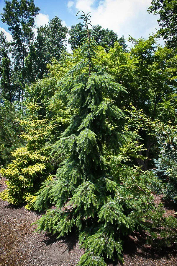 Picea omorika ‘Pendula’ is more commonly referred to as weeping Serbian spruce, which is actually a name used for a handful of different spruces and can cause some confusion. This particular example ought not to be confused with āpendula brunsā which has an extraordinary growth habit, although there are similarities. Pendula can be easily manipulated to produce a tall and exceedingly striking conical tree whose branches sweep towards the ground with heavy pendulous needles. However, as it does not grow with a central leader, you can choose to let it mound and scramble or even train it to arch over pathways, allowing a delightful curtain of deep green needles to develop. This is a stunning and versatile spruce that makes a superb specimen tree or feature in any landscape. When staked young it will form a lovely upright tree reaching heights of around 40 feet with a width of around eight feet, but can sometimes exceed both.